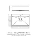[Dimensions] Exterior Dimensions: 30″ x 22″ x 9″ (Minimum Recommended cabinet size: 33 inches). Interior Dimensions: 28″ x 16.62″ . Standard 3-1/2″ drain opening fits most common garbage disposals. Recommended Cutout Size: 29.2 x 21.2 inches.