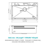 Exterior Dimensions: 30″ x 19″ x 9″ (Minimum Recommended cabinet size: 33 inches). Interior Dimensions: 27.53″ x 14.73″. Standard 3-1/2″ drain opening fits most common garbage disposals. Recommended Cutout Size: 29.2 x 18.2 inches.