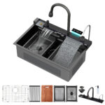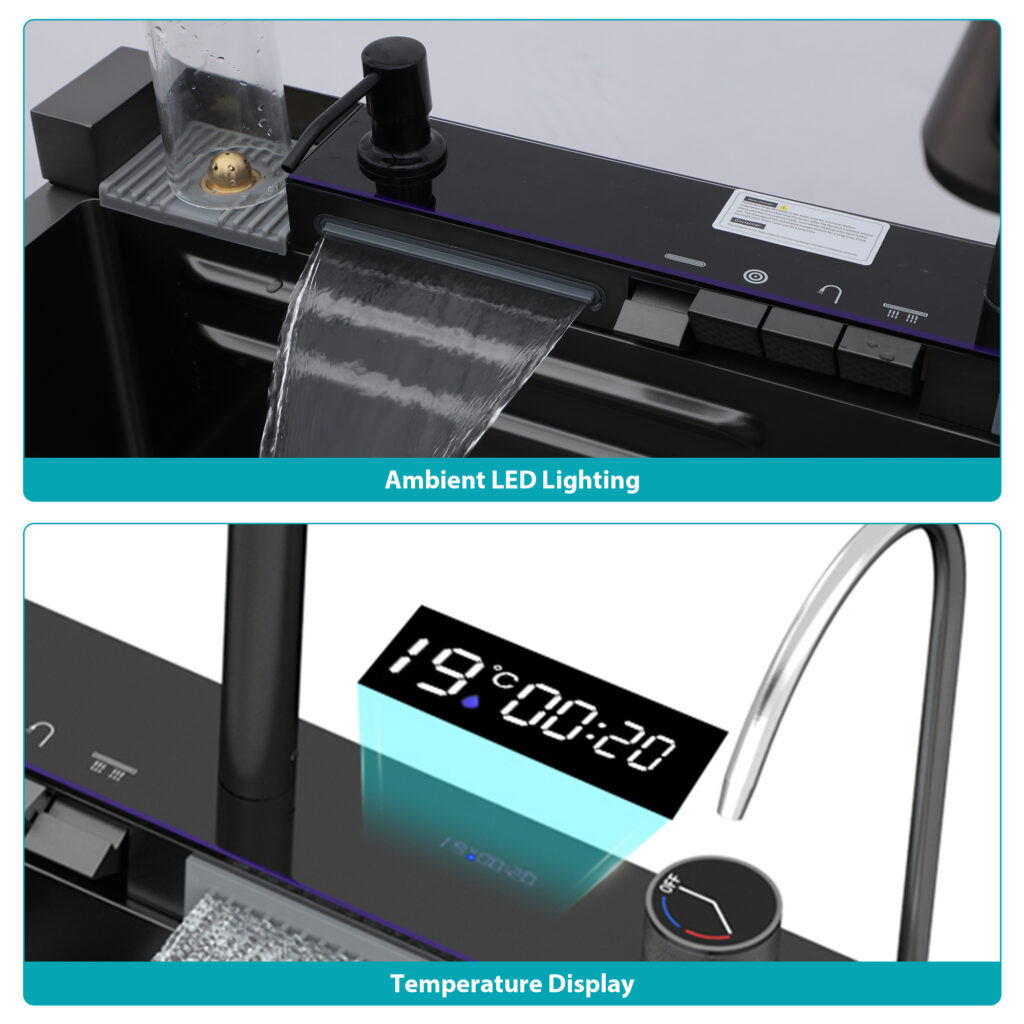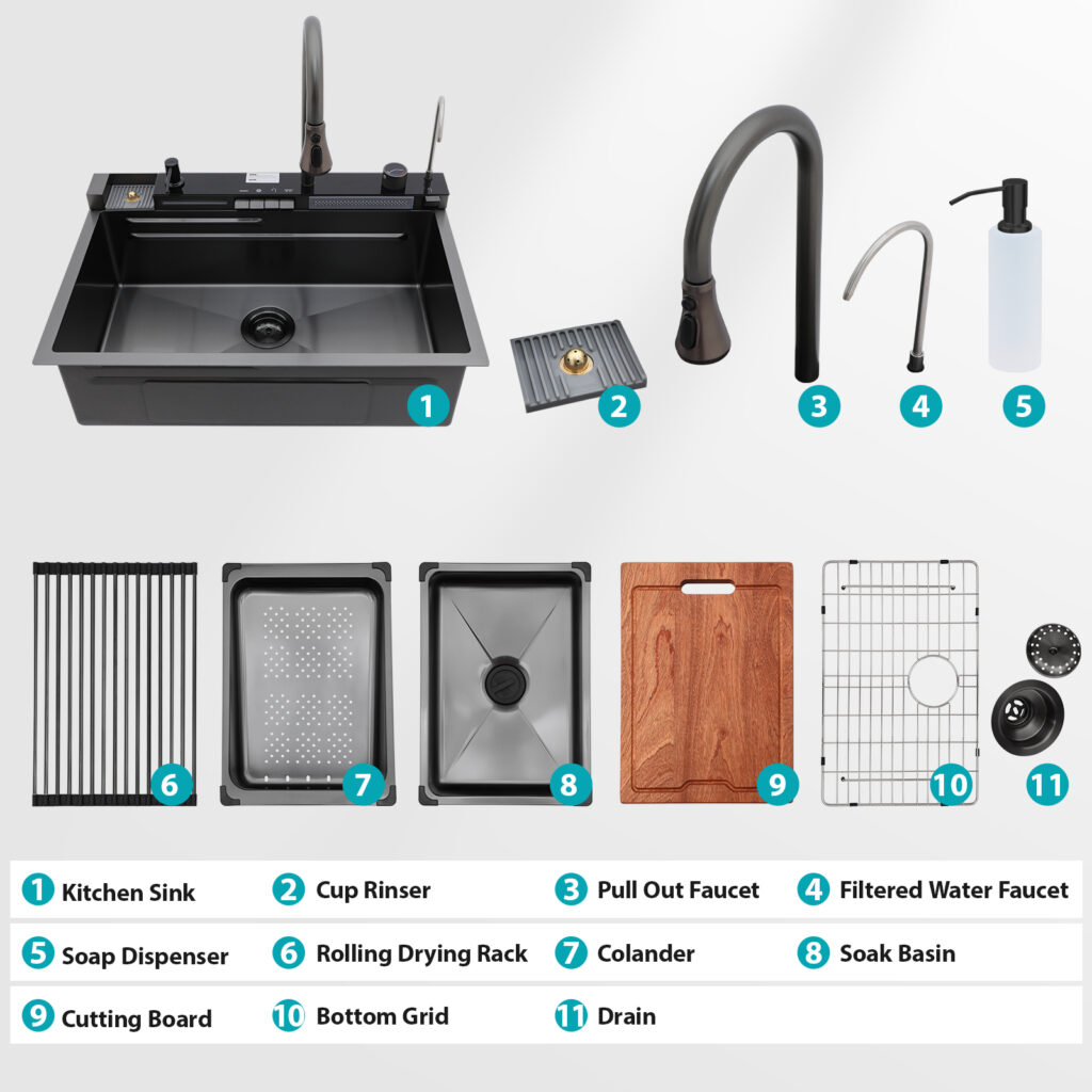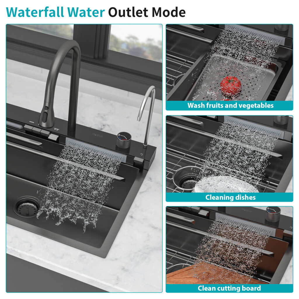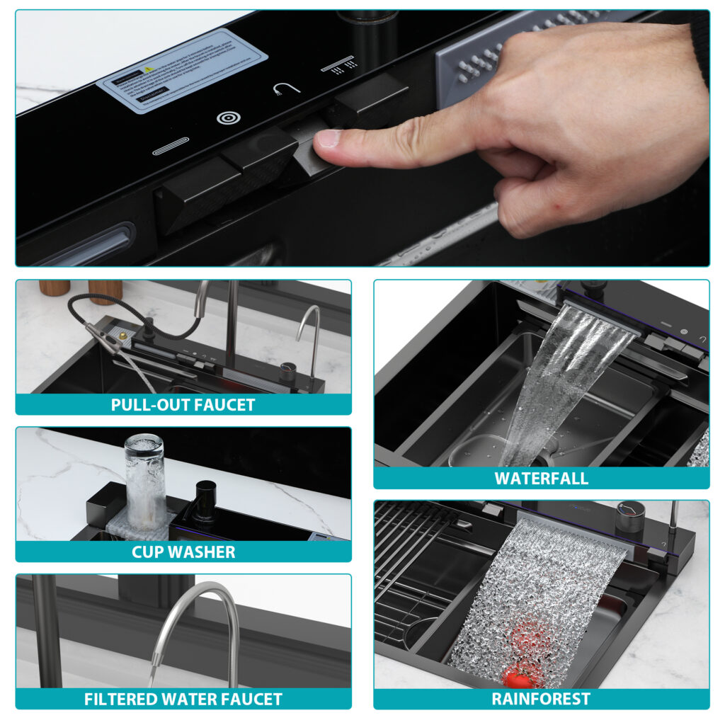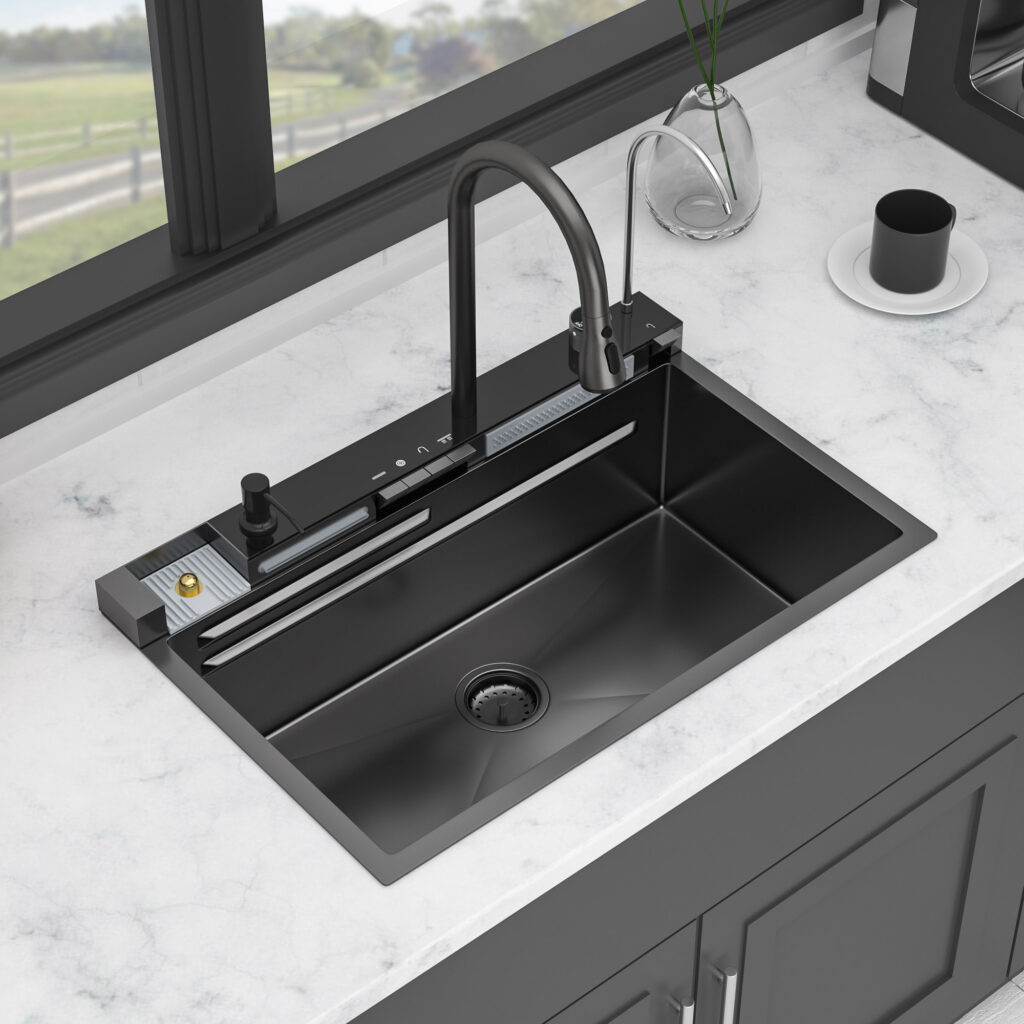 30Inch Gunmetal Black Kitchen Sink Waterfall Sink - Multifunction Single Bowl 16 Gauge Stainless Steel Ledge Workstation Smart Top Mount Kitchen Sinks