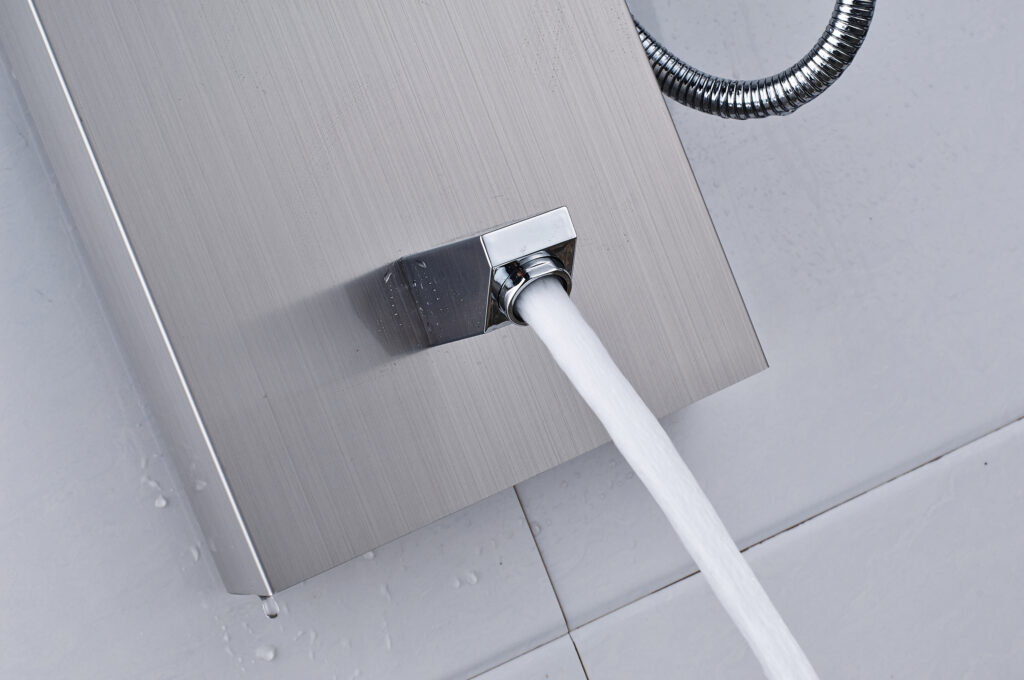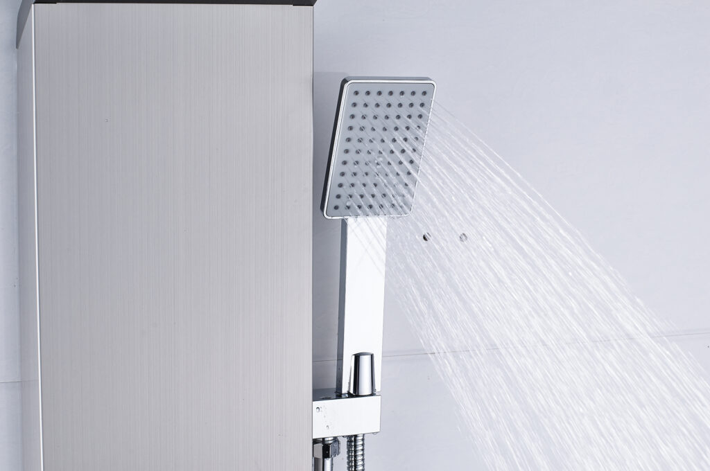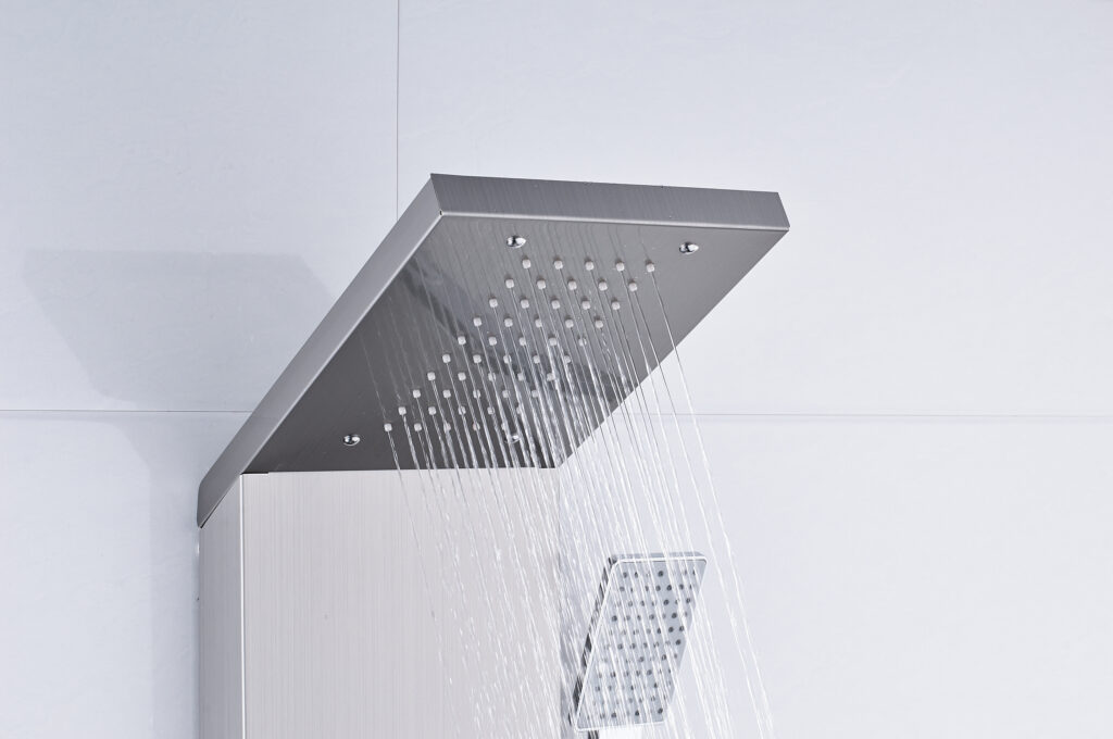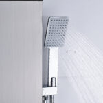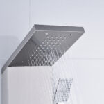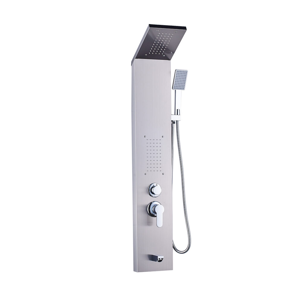 Brushed Nickel Stainless Steel Shower Panel with Rainfall Head, Body Jets & Handheld Shower ,Lower spouter– Spa-Like Bathroom Shower System