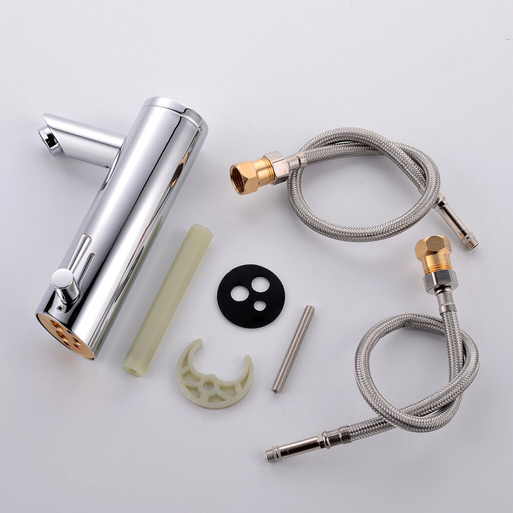 Comes with a complete installation kit (flexible supply hoses, mounting hardware, instructions) for quick setup on standard single-hole bathroom basins. The battery-powered design avoids the need for hardwiring.